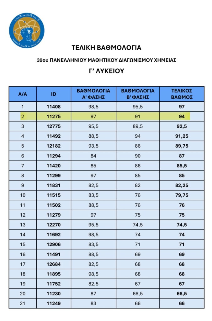 Ο μαθητής της Γ Λυκείου, Σωκράτης Βισβάρδης, κατέκτησε τη 2η θέση πανελλαδικώς στον διαγωνισμό χημείας με κωδικό συμμετοχής -11275- στην Α και Β φάση του διαγωνισμού, με τελική βαθμολογία 94/100.