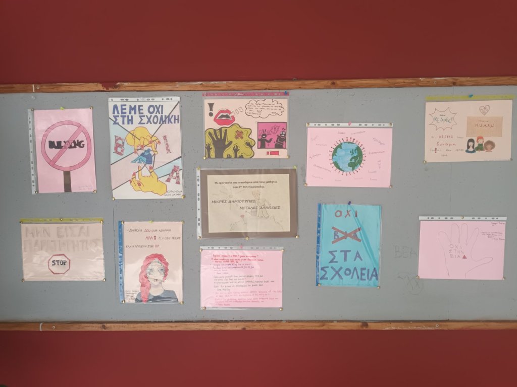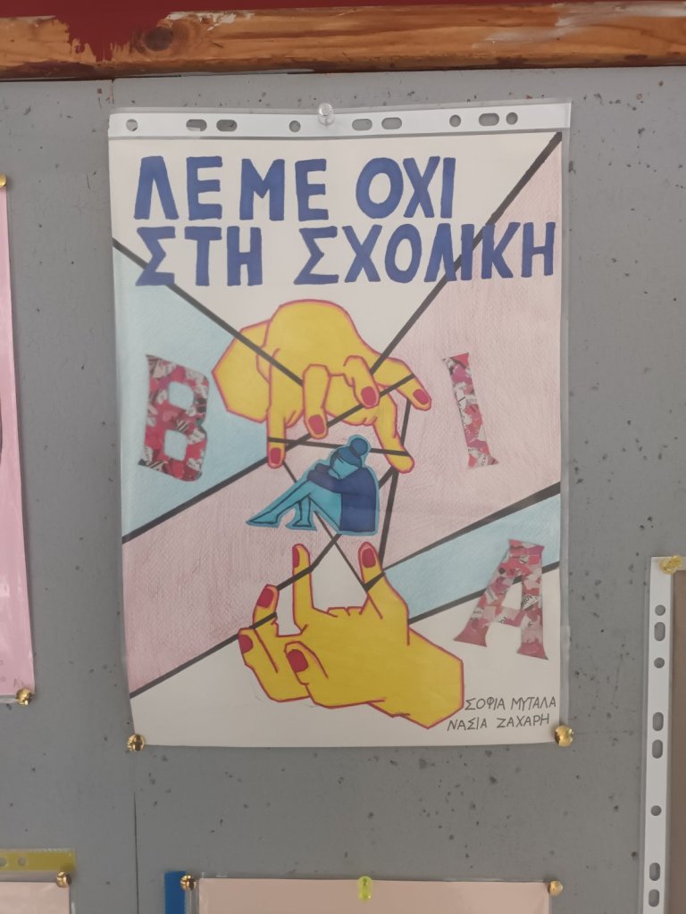 Σήμερα, Δευτέρα , 5 /5 / 2025 αναρτήθηκαν στον πίνακα ανακοινώσεων του σχολείου οι δημιουργίες των μαθητών της Α και Β Λυκείου οι οποίες περιέχουν μηνύματα κατά του Σχολικού εκφοβισμού. Υπεύθυνες καθηγήτριες, οι κ. Κοστωλιά, κ. Λογοθέτη και κ. Μπένου.